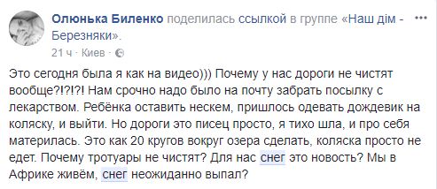 Ольга Биленко пожаловалась, что по тротуарам невозможно пройти с коляской: "Почему у нас дороги не чистят вообще?!?!?! Нам срочно надо было на почту забрать посылку с лекарством. Ребенка оставить не с кем, пришлось одевать дождевик на коляску, и выйти. Но дороги это писец просто, я тихо шла, и про себя материлась. Это как 20 кругов вокруг озера сделать, коляска просто не едет. Почему тротуары не чистят? Для нас снег это новость? Мы в Африке живём, снег неожиданно выпал?"