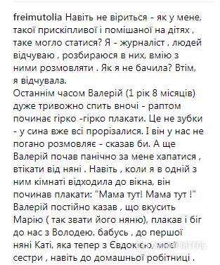"Даже не верится, как у меня, такой придирчивой и помешанной на детях, такое могло произойти? Я - журналист, людей чувствую, разбираюсь в них, умею с ними разговаривать. Как я не видела? В последнее время Валерий (1 год 8 месяцев) очень тревожно спит ночью - вдруг начинает горько-горько плакать. Это не зубки, ведь у сына уже все прорезались. Валерий начал панически меня хвататься, бежать от няни. Даже когда я в одной с ним комнате отходила к окну, он начинал плакать: "Мама здесь! Мама здесь!" Он постоянно говорил, что укусит Марию (так зовут его няню), плакал и бежал к нам", - отметила Фреймут, добавив, что со временем выяснила причину такого странного поведения своего ребенка, просмотрев камеры наблюдения, установленные в ее доме.