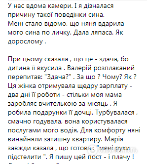 "У нас дома камеры. И я узнала причину такого поведения сына. Мне стало известно, что няня ударила моего сына по личику. Дала пощечину. Как взрослому. При этом сказала, что это - сдача, потому что ребенок ее укусил. Эта женщина получала щедрую зарплату, я делала подарки ее дочери, беспокоилась, вкусно кормила, она пользовалась услугами моего водителя. Для комфорта няни сняли уютную квартиру. Я пишу этот пост и плачу!" - подчеркнула Ольга.