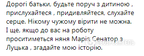 "Дорогие родители, будьте рядом с ребенком, прислушайтесь, присматривайтесь, слушайте сердце. Никому чужому верить нельзя. И еще, если к вам на работу проситься няня Мария Сенатор из Луцка, вспомните мою историю", - подытожила она.