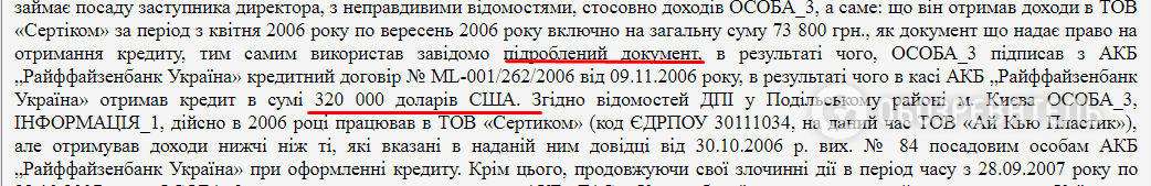 Еще в 2006 году Захарчук взял кредит в "Райффайзенбанк-Украина" в размере $320 тысяч. В документах, которые он предоставил банку, предприниматель указал, что занимает должность замдиректора ООО "Сертіком" (ныне "AQ Пластик").