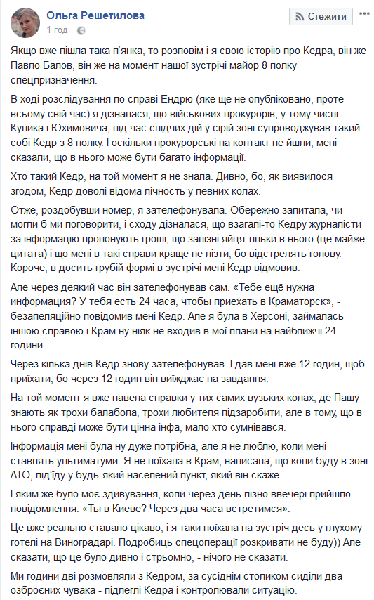 В ходе расследования по делу Эндрю (которое еще не опубликовано, однако всему свое время) я узнала, что военных прокуроров, в том числе Кулика и Ефимовича, во время следственных действий в серой зоне сопровождал некий Кедр с 8 полка. И поскольку прокурорские на контакт не шли, мне сказали, что у него может быть много информации.