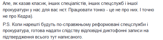 P.S. Когда наконец будут по-настоящему реформированы спецслужбы и прокуратура, готова предоставить следствию соответствующие диктофонные записи в подтверждение всего здесь написанного", - написала Ольга Решетилова.