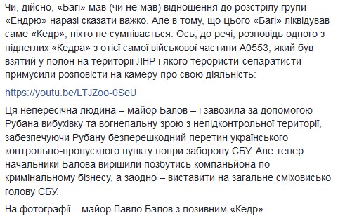 Наверное, самой известной операцией, которую приписывают "Кедру", стала ликвидация 2 октября 2016 года на территории ЛНР гражданина России Армена Багирян по прозвищу "Баги", чей труп был нужен руководству ГУР МО для того, чтобы на него "повесить" расстрел под Счастьем в сентябре 2015 года сводной мобильной группы во главе с внештатным сотрудником СБУ Андреем Галущенко ("Эндрю"). Эта группа фиксировала факты нелегального пересечения грузов через линию разграничения и сильно донимала военным разведчикам, для которых "контрабанда" была - и, наверное, есть и сейчас - главным источником дохода.