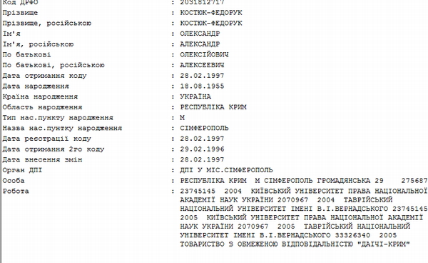 У Максима Стопченко есть супруга – Ирина Евгеньевна Костюк-Федорук. Точнее, Костюк-Федорук она было до 2014 года, когда поменяла фамилию на мужнину – Стопченко. Это позволило Максиму Стопченко при заполнении декларации за 2016 год не подать в нее фирмы, записанные на супругу в качестве Костюк-Федорук, что уже само по себе является преступлением. Отец Ирины Стопченко – ныне проректор Симферопольского университета по хозяйственной работе. Интересно, что до 2014 года он был в этом же университете мелкой сошкой, а потом вдруг как-то «поперло».