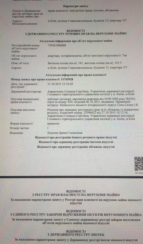 Квартира хорошая, 181 метр, четырехкомнатная, при покупке стоила не менее миллиона долларов. Но, интересно то, что покупки судя по всему не было. В 2015 году, когда появилась необходимость внесения недвижимости в электронную декларацию Ирина Луценко срочно регистрирует эту квартиру в реестре недвижимости. На основании … дубликата свидетельства о дарении. То есть, типа она была подарена неизвестным лицом, но свидетельство Луценко внезапно потеряли. Кто же был этим щедрым дарителем? Пока не знаем. Ищем.