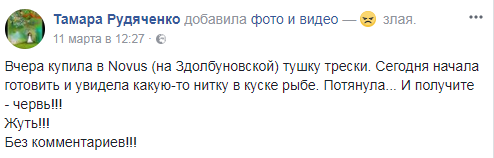 В Киеве в известном супермаркете покупательница обнаружила в рыбе червя. Тамара Рудяченко на странице в Facebook сообщила, что купила тушку трески в Novus на улице Здолбуновской.