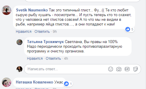 "Ужас", "Жесть", "Типичный глист, фу. Те, кто любит сырую рыбу кушать - посмотрите. И пусть теперь кто-то скажет, что у человека нет глистов совсем!" - прокомментировали они.