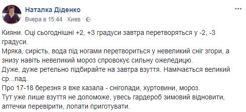 Синоптик Наталья Диденко в своем Facebook предупредила, что будет очень скользко и холодно - да так, что придется доставать зимний гардероб.