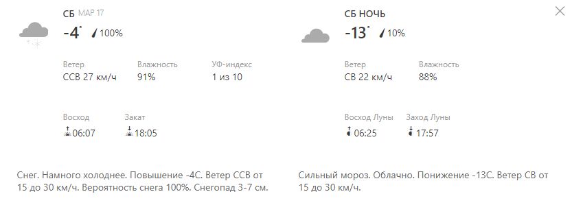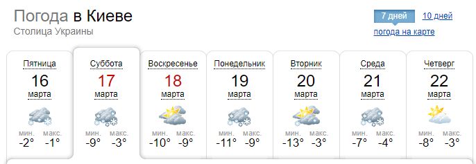 Сайт "Синоптик" предсказывает от 3 до 9 градусов мороза, снег, пасмурную погоду в субботу и переменную облачность в воскресенье.