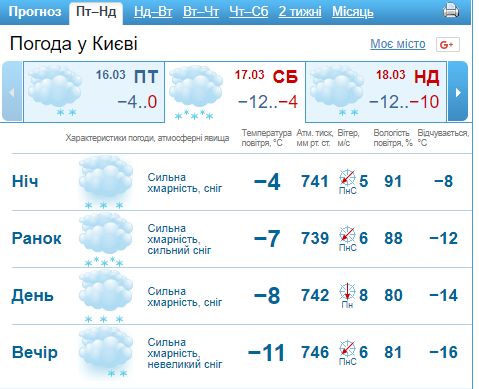 Сайт Укргидрометцентра прогнозирует в Киеве до 12 градусов мороза ночью и снег все выходные.