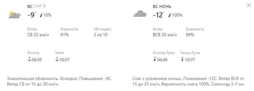 Gismeteo более пессимистичен: оба выходных пасмурно, снег, до 12 градусов мороза.
