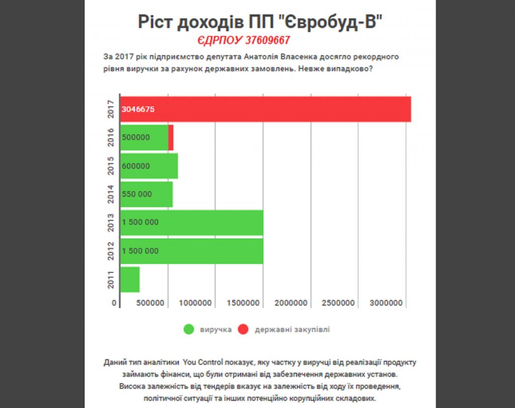 Власенко Анатолій Миколайович. Декларація за 2016 рік містить: житлова нерухомість – 69,6 м², земля – 880 м²; нежитлові приміщення (магазин і торгівельний павільйон) – 213, 8 м². Вказані автомобілі Івеко 3510 2000 року випуску і ГАЗ 330202-414-62 2008 року випуску. Доходи – 1367599 грн, грошові активи – 835286 грн (сюди ж входить і задекларована дружиною готівка та доходи її від підприємства). Корпоративні права: ПП «Євробуд-В» (вартість у грошовому еквіваленті 5000, 100% від загального капіталу). Розділ про права на об’єкт містить такі дані: Власенко Анатолій Миколайович.