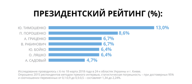 Исследование проводилось с 6 по 18 марта 2018 года по всей территории Украины (за исключением АР Крым и временно оккупированных территорий Луганской и Донецкой областей). Всего методом индивидуального интервью с глазу на глаз были опрошены 2015 человек. Статистическая погрешность при достоверных 95% и соотношении переменных от 0,1:0,9 до 0,5:0,5 составляет 1,34–2,24%.