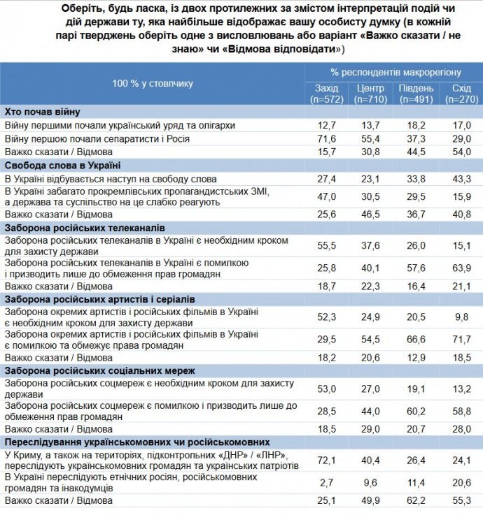 "52% придерживаются мнения, что войну начали Россия и сепаратисты (хотя это же показывает, что 15% возлагают вину на Украину, а треть имеет неопределенное мнение; учитывая, что с начала войны прошло четыре года, это является негативным фактом), а 43% считают, что в Крыму и "ДНР"/"ЛНР" преследуют украинцев и украиноязычных (против 10%, которые считают, что это в Украине преследуют русских и русскоязычных", – говорится в исследовании.
