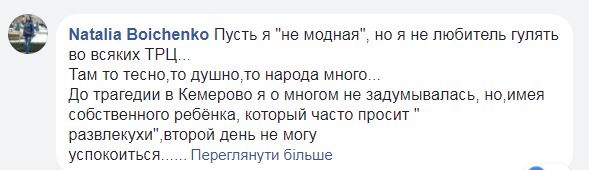 "Пусть я "не модная", но я не любитель гулять во всяких ТРЦ... Там то тесно, то душно, то народа много... До трагедии в Кемерово я о многом не задумывалась, но, имея собственного ребенка, который часто просит "развлекухи", второй день не могу успокоиться", – отмечает Наталия Бойченко.