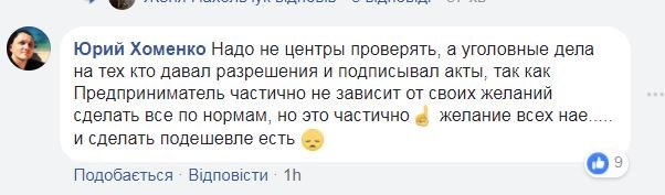 "Надо не центры проверять, а уголовные дела на тех, кто давал разрешения и подписывал акты, так как предприниматель частично не зависит от своих желаний сделать все по нормам, но это частично желание всех нае... и сделать подешевле есть", – пишет Юрий Хоменко.