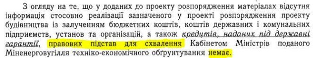 Поданий проект розпорядження розкритикував юридичний департамент уряду. Там вказали, що документ не може бути затвердженим, бо в ньому Міненерго не вказало джерело кредиту, умови його отримання та повернення: