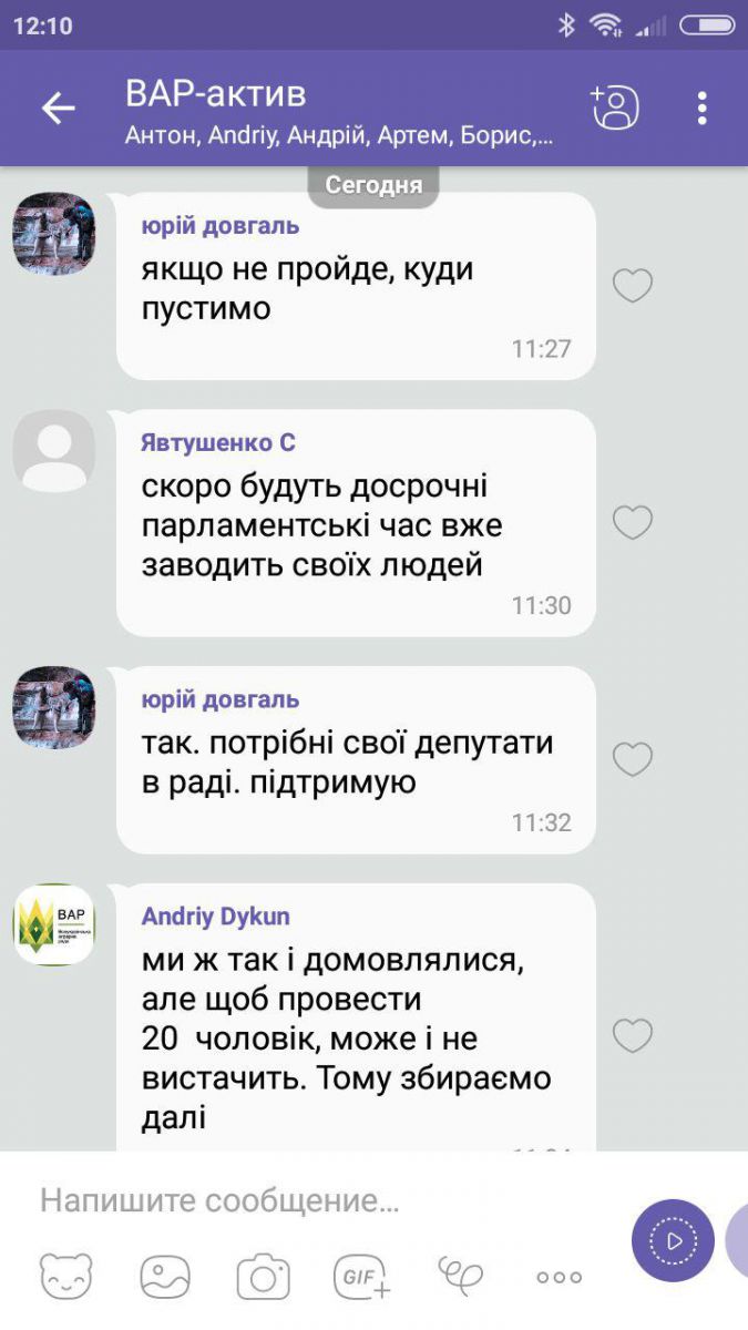 Аграрии Украины настолько активно откликнулись на призыв, что в распоряжении ВАР оказалось 47 млн. долларов «народных» денег. С учетом того, что рассмотрение и голосование за законопроект в Верховной Раде все откладывается, руководство ВАР уже подумывает, куда бы эти деньги «правильно» пристроить и собирает мнения жертвователей. Вот, например, переписка руководителя ВАР Андрея Дыкуна с его коллегами в вайбере: