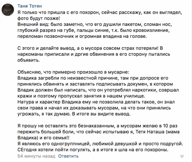 Его девушка Таня написала в комментариях, что была на его похоронах и видела на теле следы пыток и побоев. В «полиции» Влада душили пакетом, били по голове.