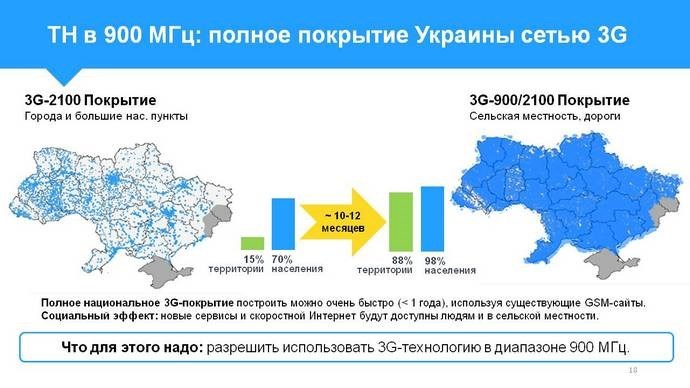 Мобильные операторы стран ЕС могут строить 3G/4G-сети на "низких" радиочастотах, а украинские мобильные операторы — "Киевстар", Vodafone Украина, lifecell — не могут. В данном случае "низкими" радиочастотами называют радиочастоты в диапазоне 700-900 МГц, а "высокими" — радиочастоты 1800 МГц, 2100 МГц, 2600 МГц, пишет "Экономическая правда".
