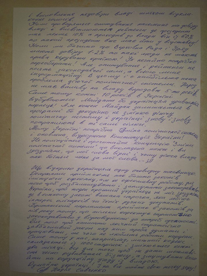 Н.С.», — написала заключенная Надежда Савченко.