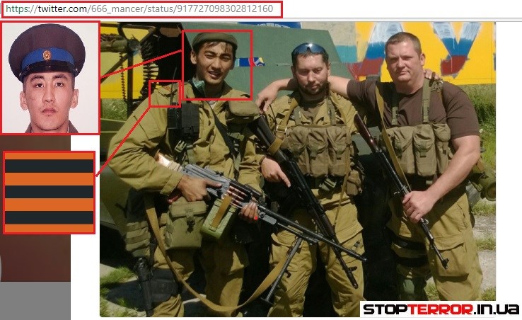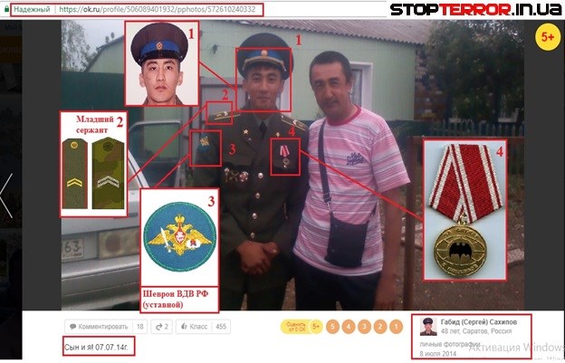 "Помимо того, что Сахипов Руслан находился в Сирии, как военнослужащий РФ он побывал и на территории Украины, в Луганской области. Тоже выполняя очередное специальное задание, за что и был награжден медалью "За Веру и Волю". И в подтверждение пребывания Сахипова в рядах иррегулярных подразделений РФ, мы приводим фотоматериалы, на которых без труда можно опознать последнего", - пишут волонтеры.