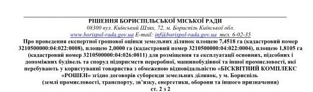 Как стало известно KV, 27 марта 2018 года Бориспольский городской совет отказал ООО “Бисквитный комбинат “Рошен” в согласовании очередного земельного решения. В частности, речь идет об экспертной оценке на предмет стоимости трех участков площадью 11,2623 гектара, арендованных “Рошеном” на территории города для возведения нового завода по производству сладостей.