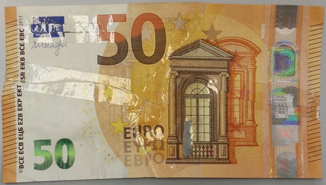 Каждый полтинник сложен из четырех частей настоящих купюр серии "Европа", введенных в оборот 4 апреля 2017 года, которые склеены прозрачной клейкой лентой.