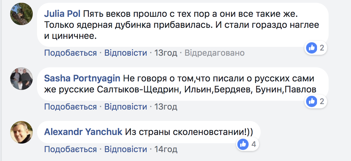 "Пять веков прошло с тех пор а они все такие же. Только ядерная дубинка прибавилась. И стали гораздо наглее и циничнее", - отметила Юлия Пол.