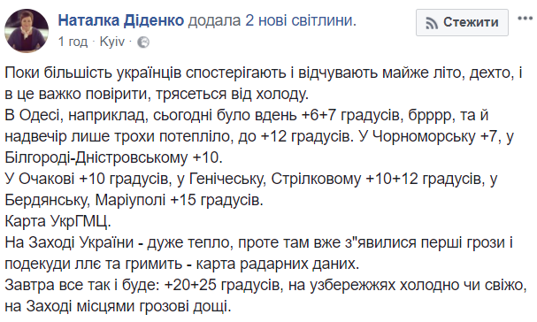 "Пока большинство украинцев наблюдает и чувствует почти лето, кое-кто, и в это сложно поверить, трясется от холода. В Одессе, например, сегодня было днем +6+7 градусов, брррр, и к вечеру только немного потеплело, до +12 градусов. В Черноморске +7, в Белгороде-Днестровском +10", - написала она.