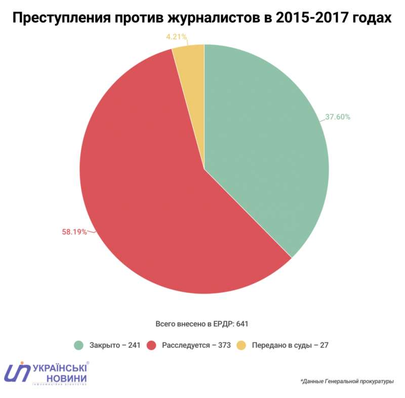 За 2015-2017 года было внесено в ЕРДР 641 дело по 5 "журналистским" статьям Уголовного Кодекса. 38% дел было закрыто на стадии следствия. 58% продолжали расследовать. Большинство таких дел становятся "висяками". Их потом списывают по сроку давности. Но в некоторых случаях следствию удается добиться успеха. Если успехом можно считать передачу дела в суд. За 3 года попали в суд 27 дел. Это 4% от всех внесенных в ЕРДР случаев.