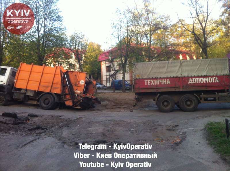 "Думаете, что видели все? А вот вам на Ушакова, 8А, мусоровоз провалился под асфальт. На месте техническая помощь, думают, как его достать", – сообщает "Киев оперативный" в Facebook.