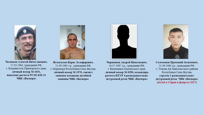 Служба безопасности Украины обнародовала имена некоторых наемников ЧВК «Вагнера», которых крейсер «Варяг» ВМФ России тайно доставил из Владивостока в Сирию. По словам главы СБУ Василия Грицака, это были жители Приморского края, Амурской области и Республики Саха-Якутия Российской Федерации.