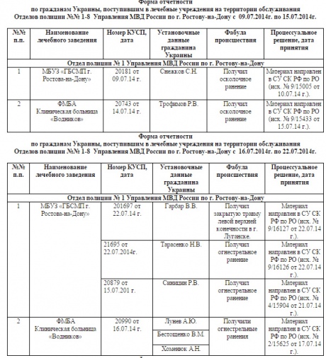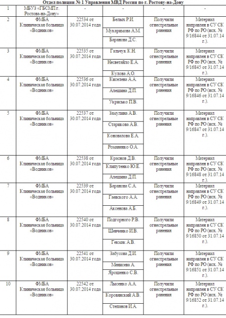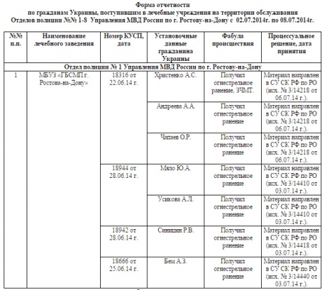 «Вот очень маленькая отчетность, которую исправно составлял начальник Дежурной части УМВД России по г. Ростову-на-Дону майор полиции М.Ю. Лобасов», — отметила Васильева и добавила: «Если все эти граждане Украины получили огнестрельное ранение на территории своей страны — Украины — то что они делают в России, чем их вывезли в Россию и еще на каждого Следственный комитет РФ завел уголовное дело? «.