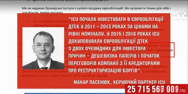 Так, что это за всезнающие люди? Облигации купила компания ICU которую возглавляет Макар Пасенюк. Очень надежный человек, раз сам президент доверил ему продажу собственной компании "Рошен". Финансовая группа стала уникальной кузницей финансовых кадров для Порошенко: Валерия Гонтарева перед тем как возглавить Нацбанк имела там значительную долю акций, акционер Владимир Димчишин был министром энергетики и углепрома в период разработки формулы "Роттердам +" и молодой председатель НКРЕКП Дмитрий Волк с легкой руки которого была привлечена эта формула тоже с родословной ICU.