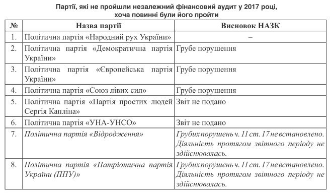 Вісім політичних партій не пройшли фінансовий аудит минулоріч, хоча повинні були це зробити.