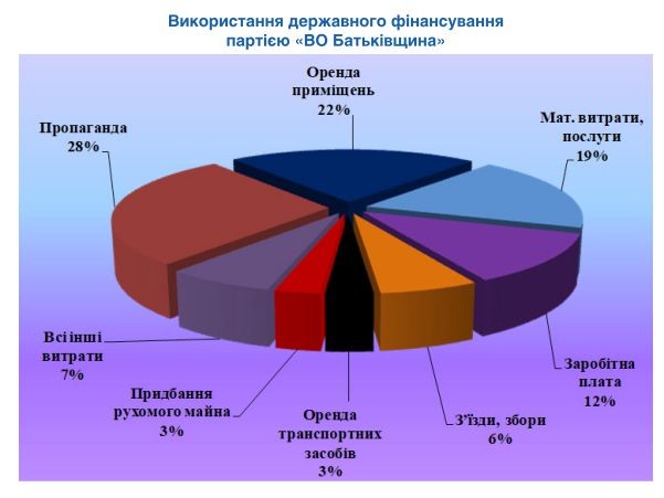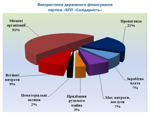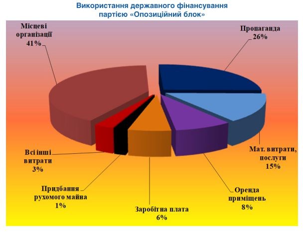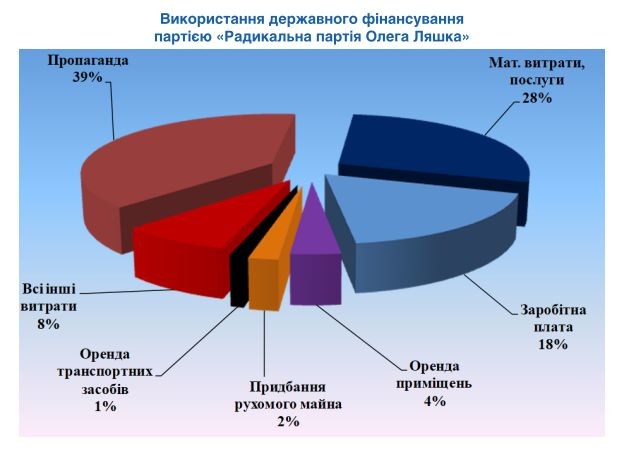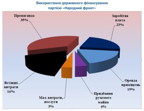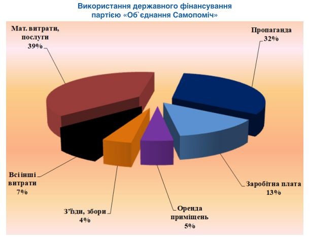 На свою рекламу, агітацію та пропаганду партії витрачають 21-39% виділених державою коштів: найскромніші — БПП «Солідарність», найбільш охочі попіаритися – у Радикальній партії Олега Ляшка. У середньому ж на пропаганду витрачається третина коштів, на місцеві організації та на різні матеріальні послуги – по 17%, на зарплату – 14%. На оренду приміщень – у середньому 9% (як писав «Главком», часто «на пільгових умовах» — зокрема, таке формулювання зустрічається у річному звіті «Народного фронту»), на придбання рухомого майна було витрачено 2% коштів, і ще 1% — на збори та з’їзди партії. Інші витрати становили 10%.