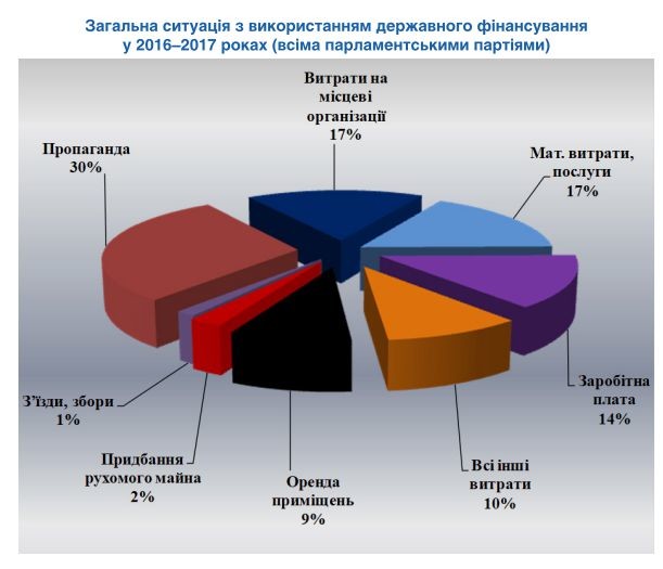 Згідно зі звітом, абсолютну більшість коштів, отриманих від держави у 2016– 2017 роках, парламентські політсили витратили на оренду офісів, придбання техніки, виплату заробітної плати, пропагандистську діяльність. Лише окремі партії сфокусувалися на потребах своїх місцевих організацій. «З юридичної точки зору абсолютна більшість цих витрат є цілком законною. Утім, з превеликими жалем доводиться констатувати, що ці витрати практично не сприяли розвитку плюралістичної демократії в Україні», — йдеться у звіті.