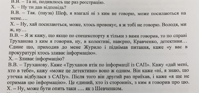 В рамках рассекреченного и частично обнародованного разговора Холодницкий спрашивает Кривенко о том, что будет, если свидетели дадут показания, что Труханов и его люди ничего не знали, можно ли их вывести из материалов дела.