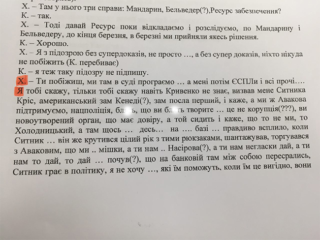 НАБУ обнародовало не весь диалог, а он интересен. В рамках того же разговора Кривенко и Холодницкий обсуждают как раз утечку материалов дела. И заместитель руководителя САП божится, что ни с кем об этом не говорил, кроме как в коллективе.