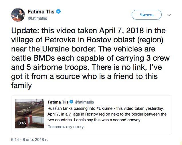 8 апреля журналистка «Голоса Америки» Фатима Тлис поделилась в сети видео, на котором якобы «российские танки заходят в Украину» в Ростовской области. Она не уточнила, где было снято видео, однако указала, что эта деревня находится возле границы с Украиной, и видео было снято недавно. На видео показана колонна российских БМП-3, говорится в расследовании лаборатории цифровой криминалистики «Атлантического совета» (DFRLab).