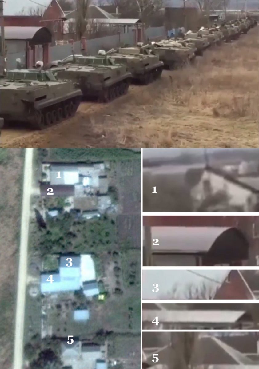 «Сравнив крыши, которые видно на видео, со спутниковыми снимками, мы подтвердили геолокацию: видео было действительно снято в этой деревне, а камера была направлена на юг», – отметили в DFRLab.