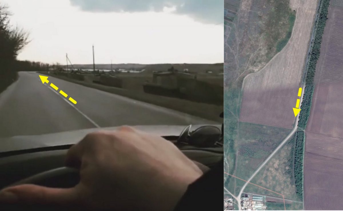 Этот указатель помог расследователям геолоцировать видео: оно было снято на въезде на хутор с севера. Слева от камеры (на востоке) видна лесополоса, а справа (к западу) — поле.