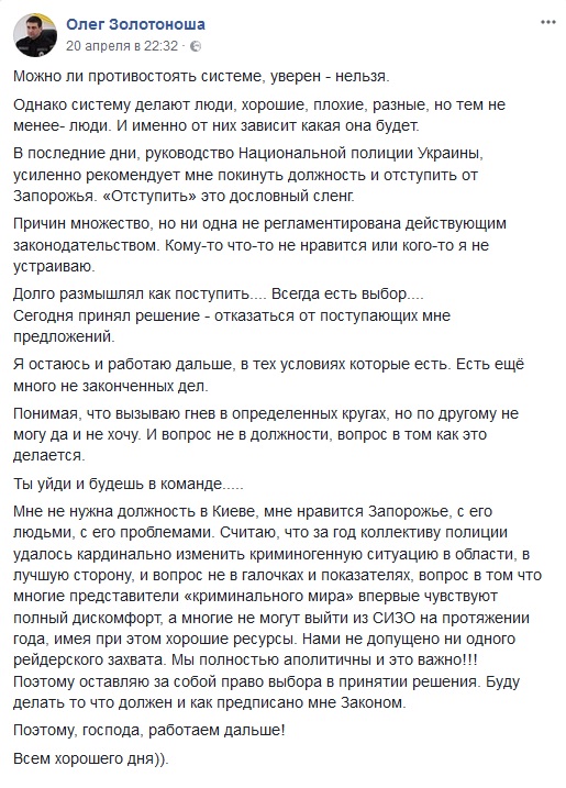 Возможно это какая-то «Децентрализация по-новому»? 20 апреля главный полицейский Запорожской области написал в социальной сети «Фейсбук», что столичное руководство (Глава нацполиции украины — Сергей Князев) настоятельно рекомендовало ему покинуть должность, но он принял решение остаться.