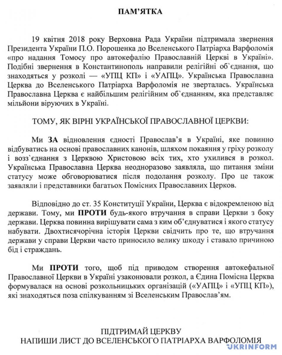 Вместе с бланками письма мирянам раздают памятку, в которой говорится, что автокефалия нарушит их конституционные права.