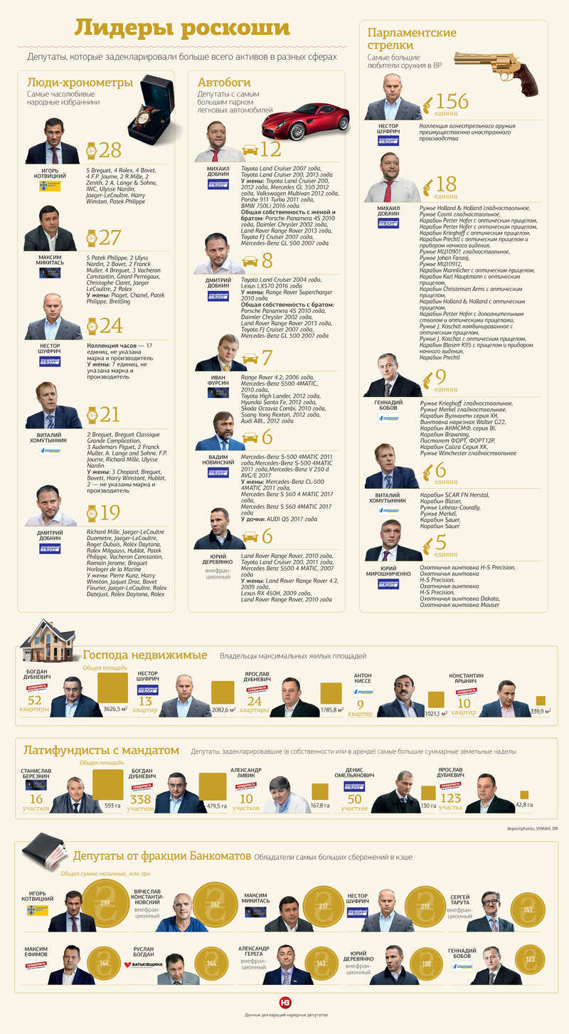 Топ-политики обнародовали электронные декларации, указав целые арсеналы оружия, элитные коллекции часов и автопарки, а также миллионы гривен кэша, пишет сегодня журнал Новое Время.