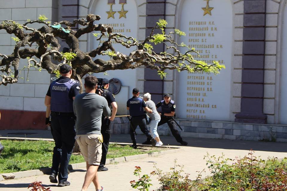 В Одессе во время первомайского митинга полицейские задержали пожилую женщину, которая отбивалась от них палкой, пишут СМИ.