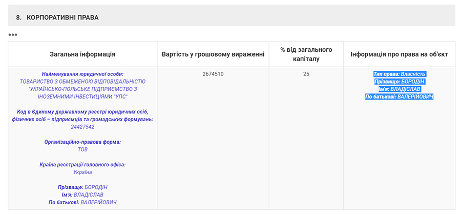 "Бездорожье, которым проехались журналисты, обошлось жителям Днепропетровщины в 584 миллиона гривен - в 2016 и 2017 году на ремонт дорог из бюджета было выделено 303 млн и 281 млн гривен соответственно. Тендер на ремонт областных дорог оба года подряд выигрывала компания "УПС" - общество с ограниченной ответственностью "Украинско-польское предприятие с иностранными инвестициями "УПС "- 25% процентов которой, согласно декларации, принадлежит Бородину Владиславу Валерьевичу (депутат Днепропетровского областного совета – Ред.)", – говорится в материале.