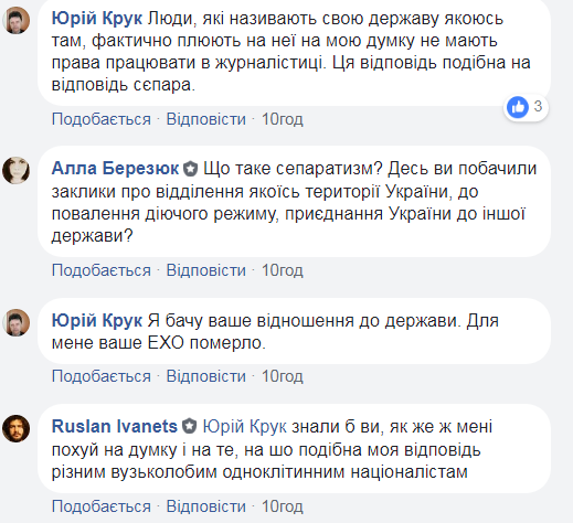 На эту реплику журналист и обозвал свою страну. Кроме того, на замечание авторов по поводу сепаратистских высказываний, он резко высказался по поводу того, что он думает.